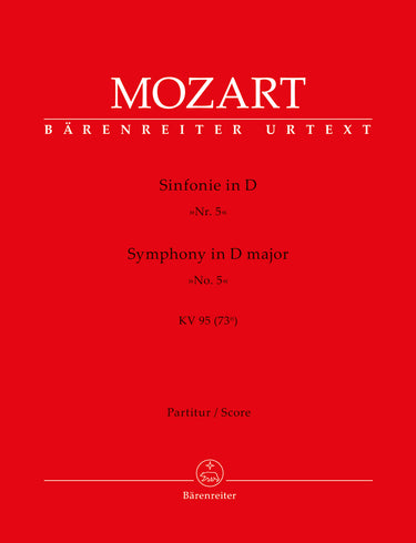 **Title**: Symphony no. 45 in D major K. 95 (73n) | **Composer / Author**: Mozart, Wolfgang Amadeus | **Libretto/Text by**: Allroggen, Gerhard | **Edition Type**: Score, Urtext edition | **Instrumentation**: Orchestra | **Scoring/ Instrumentation**: Orchestra | **Binding**: Stapled | **Duration**: 00:11:00 | **Weight**: 83.0 g | **Format**: 30,0 x 23,0 cm | **Pages**: 16 S. | **Language**: EN | Sample: https://data.baerenreiter.com/NB/BA/BA05376_00_9790006501465_nb_lrg_01.jpg