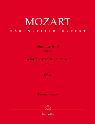 **Title**: Symphony no. 5 in B-flat major K. 22 | **Composer / Author**: Mozart, Wolfgang Amadeus | **Editor**: Allroggen, Gerhard | **Edition Type**: Score, Urtext edition | **Instrumentation**: Orchestra | **Scoring/ Instrumentation**: Orchestra | **Binding**: Stapled | **Weight**: 84.0 g | **Format**: 30,0 x 23,0 cm | **Pages**: 14 S. | **Language**: EN | Sample: https://data.baerenreiter.com/NB/BA/BA09167_00_9790006528196_nb_lrg_01.jpg
