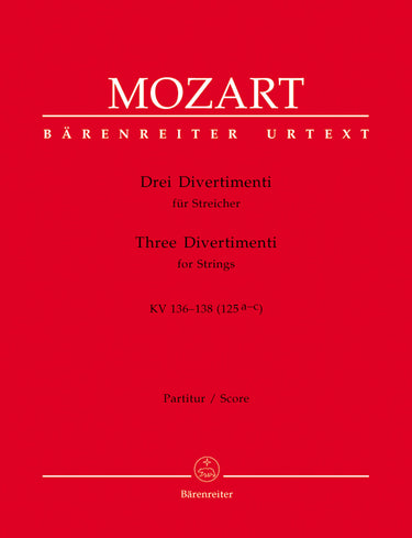 **Title**: Three Divertimenti for Strings K. 136-138 (125a-c) | **Composer / Author**: Mozart, Wolfgang Amadeus | **Editor**: Füssl, Karl Heinz | **Edition Type**: Score, Urtext edition, Anthology | **Scoring/ Instrumentation**: String orchestra | **Binding**: Stapled | **Printing**: 15th printing 2024 | **Weight**: 194.0 g | **Format**: 31,0 x 24,3 cm | **Pages**: 38 S. | **Language**: EN | Sample: https://data.baerenreiter.com/NB/BA/BA04857_00_9790006457410_nb_lrg_01.jpg