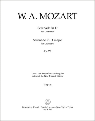 **Title**: Serenade in D major K. 239 | **Misc Information**: Serenata notturna | **Composer / Author**: Mozart, Wolfgang Amadeus | **Editor**: Haußwald, Günter | **Edition Type**: Part, Urtext edition | **Scoring/ Instrumentation**: Timpani | **Binding**: Stapled | **Weight**: 17.0 g | **Format**: 32,5 x 25,5 cm | **Pages**: 3 S. | **Language**: EN | Sample: https://data.baerenreiter.com/NB/BA/BA05321_63_9790006467679_nb_lrg_01.jpg