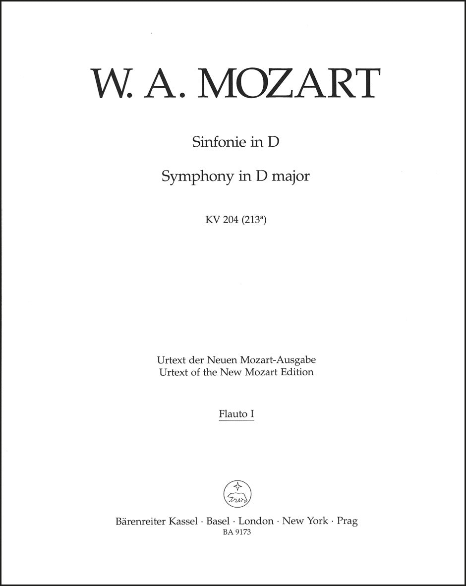 **Title**: Symphony in D major | **Misc Information**: based on Serenade K. 250 (248b) | **Composer / Author**: Mozart, Wolfgang Amadeus | **Editor**: Haußwald, Günter | **Edition Type**: Wind set, Urtext edition | **Scoring/ Instrumentation**: 1. Flute, 2. Flute, 1. Oboe, 2. Oboe, Bassoon, 1. Horn, 2. Horn, 1. Trumpet, 2. Trumpet | **Binding**: Stapled | **Weight**: 157.0 g | **Format**: 33,0 x 26,0 cm | **Pages**: 3/1/5/4/7/4/4/3/3 S. | **Language**: EN | Sample: https://data.baerenreiter.com/NB/BA/BA09173_65_9790006528561_nb_lrg_01.jpg