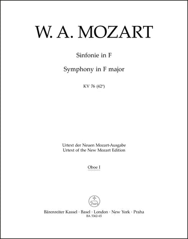**Title**: Symphony in F major K. 76(42a) | **Composer / Author**: Mozart, Wolfgang Amadeus | **Editor**: Allroggen, Gerhard | **Edition Type**: Wind set, Urtext edition | **Scoring/ Instrumentation**: Oboes (2), Bassoons (2), Horns (2) | **Binding**: Folded | **Weight**: 106.0 g | **Format**: 32,5 x 25,5 cm | **Pages**: 3/3/3/3/3/3 S. | **Language**: EN | Sample: https://data.baerenreiter.com/NB/BA/BA05362_65_9790006469314_nb_lrg_01.jpg