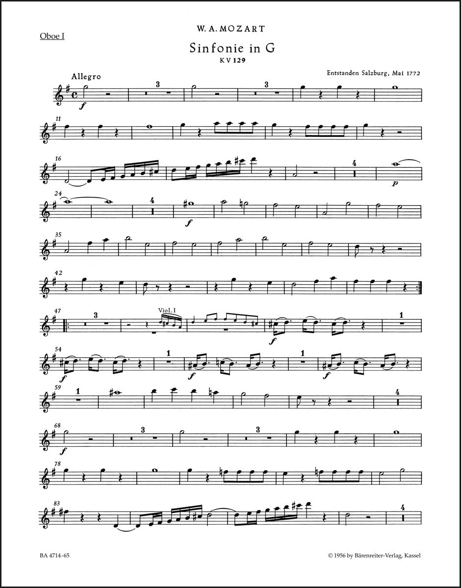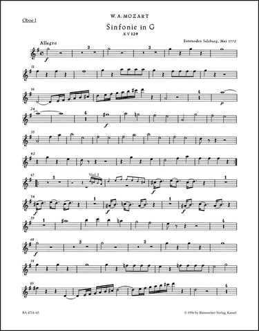**Title**: Symphony no. 17 in G major K. 129 | **Composer / Author**: Mozart, Wolfgang Amadeus | **Editor**: Fischer, Wilhelm | **Edition Type**: Wind set, Urtext edition | **Scoring/ Instrumentation**: Oboes (2), Horns (2) | **Binding**: Stapled | **Duration**: 00:09:00 | **Weight**: 101.0 g | **Format**: 32,5 x 25,5 cm | **Pages**: 5/5/4/4 S. | **Language**: EN | Sample: https://data.baerenreiter.com/NB/BA/BA04714_65_9790006453696_nb_lrg_01.jpg