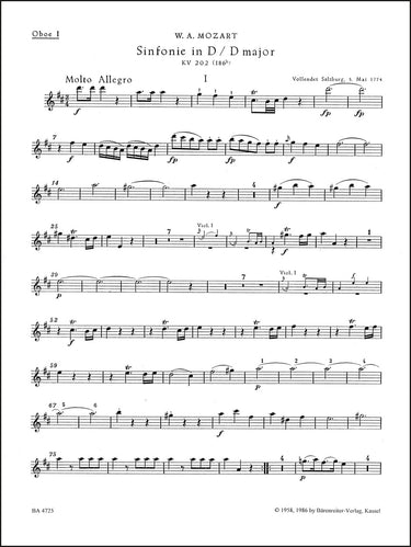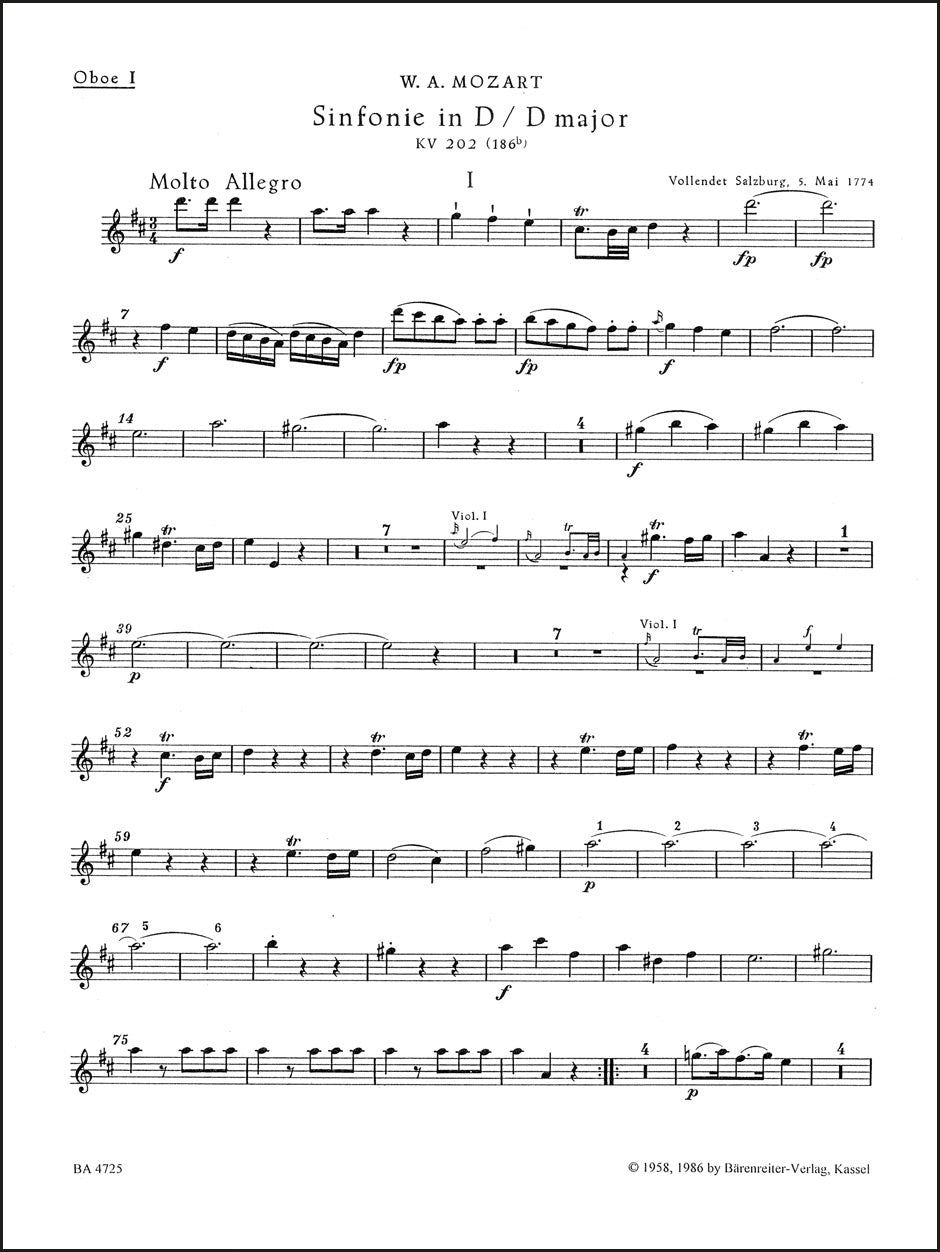 **Title**: Symphony no. 30 in D major K. 202(186b) | **Composer / Author**: Mozart, Wolfgang Amadeus | **Editor**: Beck, Hermann | **Edition Type**: Wind set, Urtext edition | **Scoring/ Instrumentation**: Oboes (2), Horns (2), Trumpets (2) | **Binding**: Folded | **Weight**: 103.0 g | **Format**: 32,5 x 25,5 cm | **Pages**: 4/4/4/4/4/4 S. | **Language**: EN | Sample: https://data.baerenreiter.com/NB/BA/BA04725_65_9790006454273_nb_lrg_01.jpg