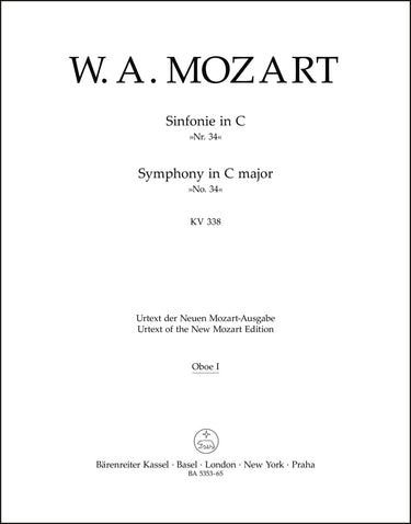 **Title**: Symphony no. 34 in C major K. 338 | **Composer / Author**: Mozart, Wolfgang Amadeus | **Editor**: Schnapp, Friedrich | **Edition Type**: Wind set, Urtext edition | **Scoring/ Instrumentation**: Flutes (2), Oboes (2), Bassoons (2), Horns (2), Trumpets (2), Timpani | **Binding**: Stapled | **Weight**: 300.0 g | **Format**: 32,5 x 25,5 cm | **Pages**: 5/5/7/7/5/5/5/5/5 S. | **Language**: EN | Sample: https://data.baerenreiter.com/NB/BA/BA05353_65_9790006468812_nb_lrg_01.jpg