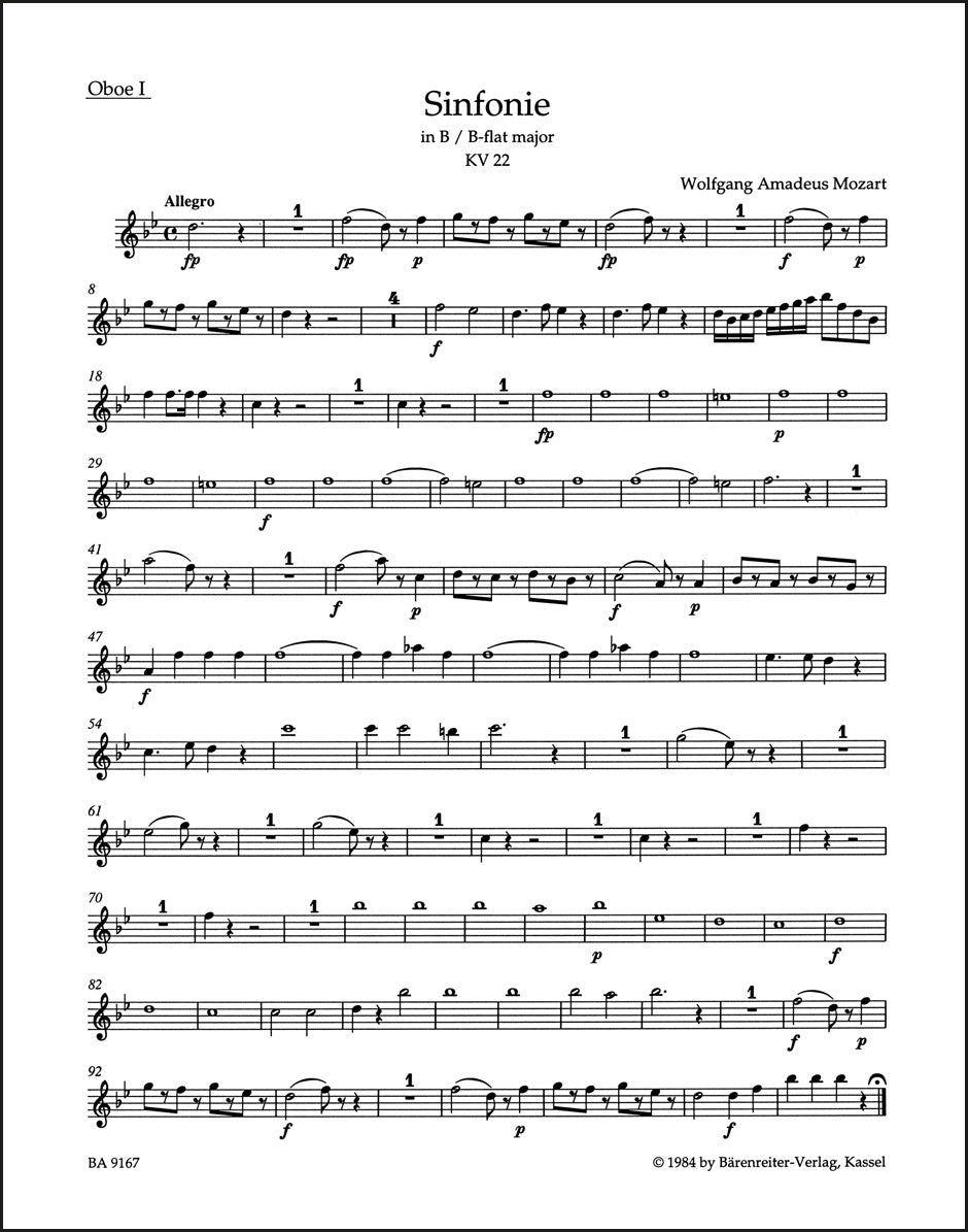 **Title**: Symphony no. 5 in B-flat major K. 22 | **Composer / Author**: Mozart, Wolfgang Amadeus | **Editor**: Allroggen, Gerhard | **Edition Type**: Wind set, Urtext edition | **Scoring/ Instrumentation**: 1. Oboe, 2. Oboe, 1. Horn, 2. Horn | **Binding**: Folded | **Weight**: 64.0 g | **Format**: 32,5 x 25,5 cm | **Pages**: 3/3/3/3 S. | **Language**: EN | Sample: https://data.baerenreiter.com/NB/BA/BA09167_65_9790006528202_nb_lrg_01.jpg