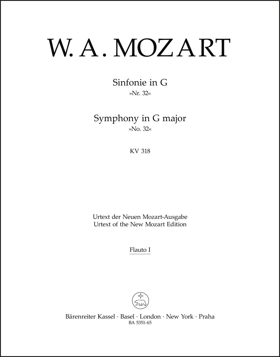 **Title**: Symphony (Overture) no. 32 in G major K. 318 | **Composer / Author**: Mozart, Wolfgang Amadeus | **Editor**: Mahling, Christoph-Hellmut | **Edition Type**: Wind set, Urtext edition | **Scoring/ Instrumentation**: Flutes (2), Oboes (2), Bassoons (2), 1. Horn (in g), 2. Horn (in g), 3. Horn (in d), 4. Horn (in d), Trumpets (2) (in c), Timpani | **Binding**: Stapled | **Duration**: 00:09:00 | **Weight**: 250.0 g | **Format**: 32,5 x 25,5 cm | **Pages**: 2/2/2/2/5/5/1/2/2/2/1/1/1 S. | **Language**: EN | Sample: https://data.baerenreiter.com/NB/BA/BA05351_65_9790006468690_nb_lrg_01.jpg