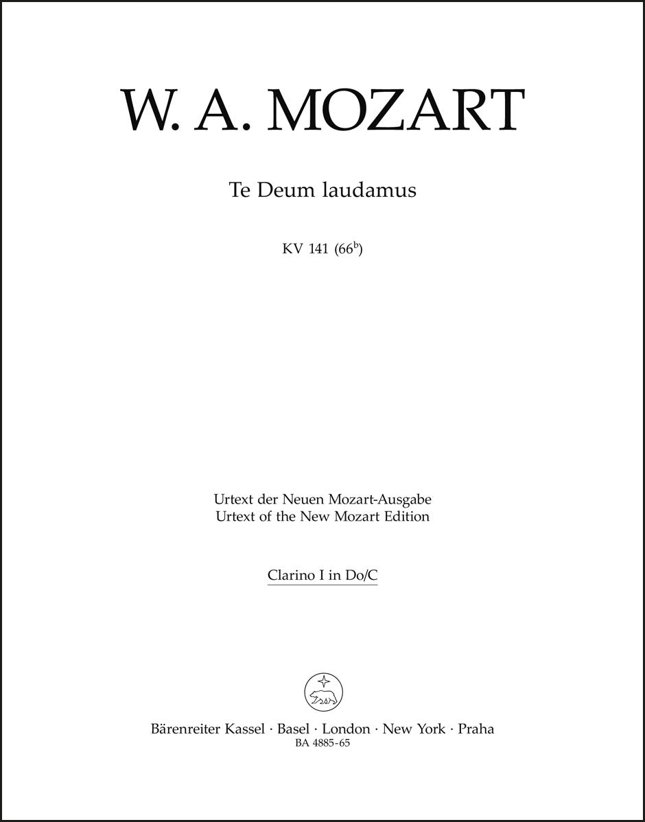 **Title**: Te Deum laudamus K. 141 (66b) | **Composer / Author**: Mozart, Wolfgang Amadeus | **Editor**: Federhofer, Hellmut | **Edition Type**: Wind set, Urtext edition | **Scoring/ Instrumentation**: 1. Trumpet, 2. Trumpet, 3. Trumpet, 4. Trumpet, Timpani | **Binding**: Stapled | **Duration**: 00:11:00 | **Weight**: 62.0 g | **Format**: 32,5 x 25,5 cm | **Pages**: 3/3/1/1/1/ S. | **Language**: EN | Sample: https://data.baerenreiter.com/NB/BA/BA04885_65_9790006458936_nb_lrg_01.jpg