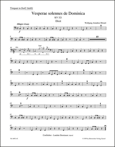 **Title**: Vesperae solennes de Dominica K. 321 | **Composer / Author**: Mozart, Wolfgang Amadeus | **Editor**: Fellerer, Karl Gustav / Schroeder, Felix | **Edition Type**: Wind set, Urtext edition | **Scoring/ Instrumentation**: Trumpets (2), Trombones (3), Timpani | **Binding**: Stapled | **Weight**: 127.0 g | **Format**: 32,5 x 25,5 cm | **Pages**: 8/8/8/2/2/2 S. | **Language**: EN | Sample: https://data.baerenreiter.com/NB/BA/BA04893_65_9790006459629_nb_lrg_01.jpg