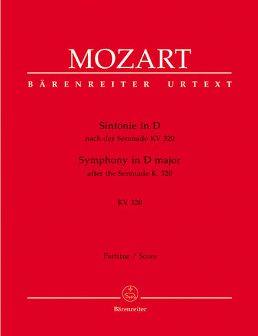 **Title**: Symphony in D major | **Misc Information**: based on Serenade K. 320 | **Composer / Author**: Mozart, Wolfgang Amadeus | **Editor**: Haußwald, Günter | **Edition Type**: Score, Urtext edition | **Instrumentation**: Orchestra | **Scoring/ Instrumentation**: Orchestra | **Binding**: Stapled | **Weight**: 181.0 g | **Format**: 30,0 x 23,0 cm | **Pages**: 43 S. | **Language**: EN | Sample: https://data.baerenreiter.com/NB/BA/BA09175_00_9790006528677_nb_lrg_01.jpg