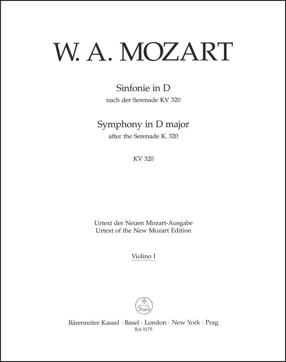 **Title**: Symphony in D major | **Misc Information**: based on Serenade K. 320 | **Composer / Author**: Mozart, Wolfgang Amadeus | **Editor**: Haußwald, Günter | **Edition Type**: Part, Urtext edition | **Scoring/ Instrumentation**: 1. Violin | **Binding**: Stapled | **Weight**: 45.0 g | **Format**: 32,5 x 25,5 cm | **Pages**: 11 S. | **Language**: EN | Sample: https://data.baerenreiter.com/NB/BA/BA09175_74_9790006528691_nb_lrg_01.jpg