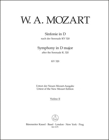 **Title**: Symphony in D major | **Misc Information**: based on Serenade K. 320 | **Composer / Author**: Mozart, Wolfgang Amadeus | **Editor**: Haußwald, Günter | **Edition Type**: Part, Urtext edition | **Scoring/ Instrumentation**: 2. Violin | **Binding**: Stapled | **Weight**: 45.0 g | **Format**: 32,5 x 25,5 cm | **Pages**: 11 S. | **Language**: EN | Sample: https://data.baerenreiter.com/NB/BA/BA09175_75_9790006528707_nb_lrg_01.jpg
