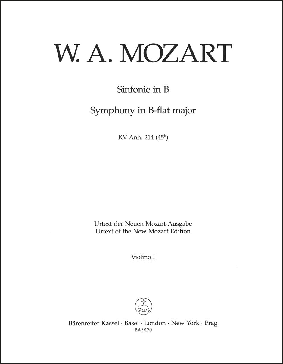 **Title**: Symphony in B-flat major K. Anh. 214 (45b) | **Composer / Author**: Mozart, Wolfgang Amadeus | **Editor**: Allroggen, Gerhard | **Edition Type**: Part, Urtext edition | **Scoring/ Instrumentation**: 1. Violin | **Binding**: Stapled | **Weight**: 29.0 g | **Format**: 32,5 x 25,5 cm | **Pages**: 5 S. | **Language**: EN | Sample: https://data.baerenreiter.com/NB/BA/BA09170_74_9790006528394_nb_lrg_01.jpg