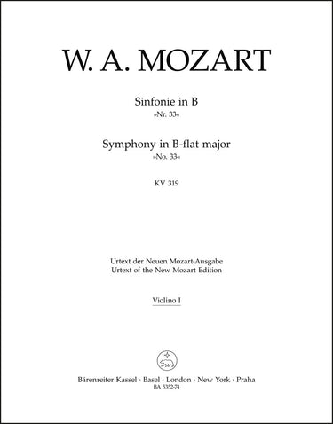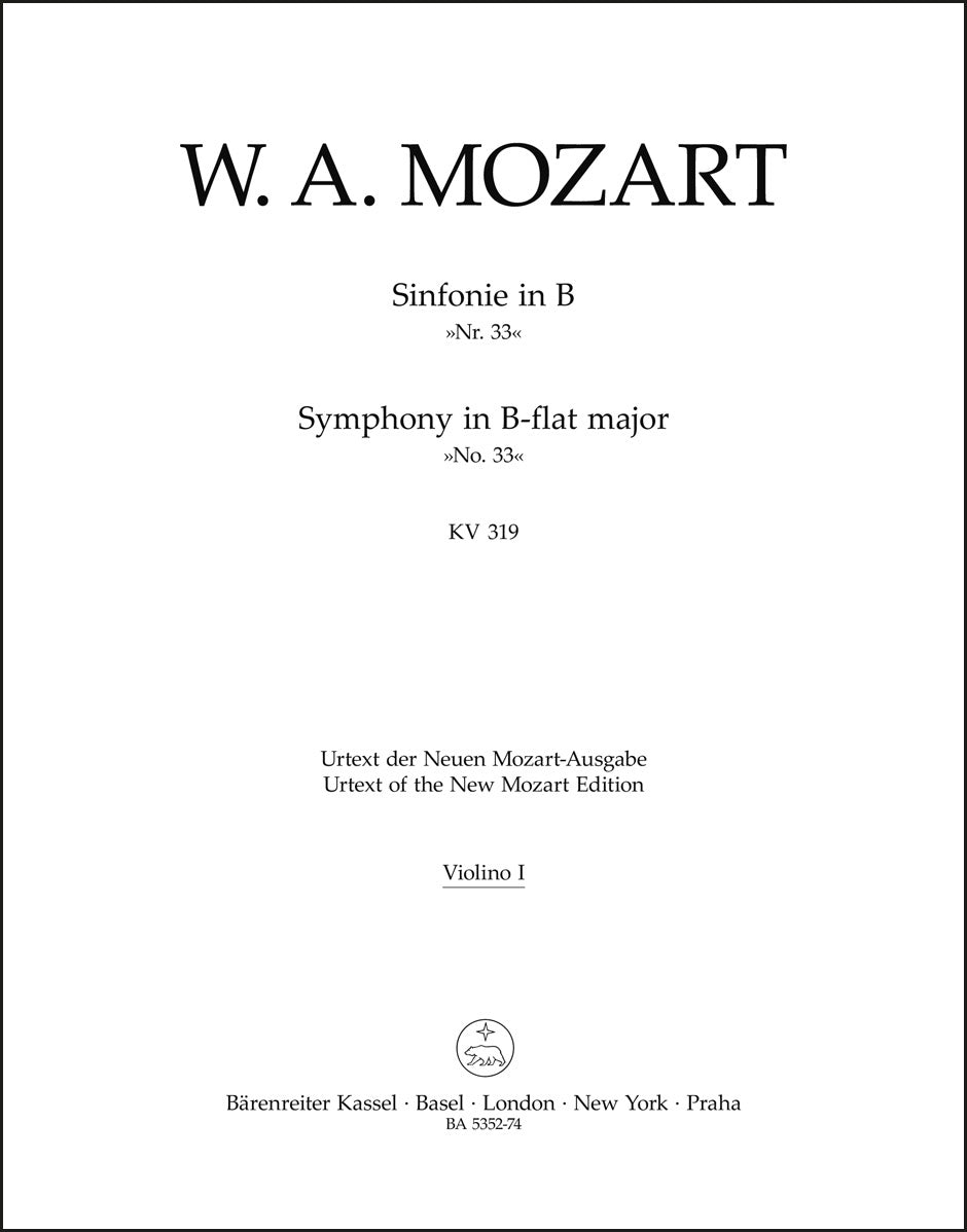**Title**: Symphony no. 33 in B-flat major K. 319 | **Composer / Author**: Mozart, Wolfgang Amadeus | **Editor**: Mahling, Christoph-Hellmut | **Edition Type**: Part, Urtext edition | **Scoring/ Instrumentation**: 1. Violin | **Binding**: Stapled | **Weight**: 49.0 g | **Format**: 32,5 x 25,5 cm | **Pages**: 11 S. | **Language**: EN | Sample: https://data.baerenreiter.com/NB/BA/BA05352_74_9790006468768_nb_lrg_01.jpg