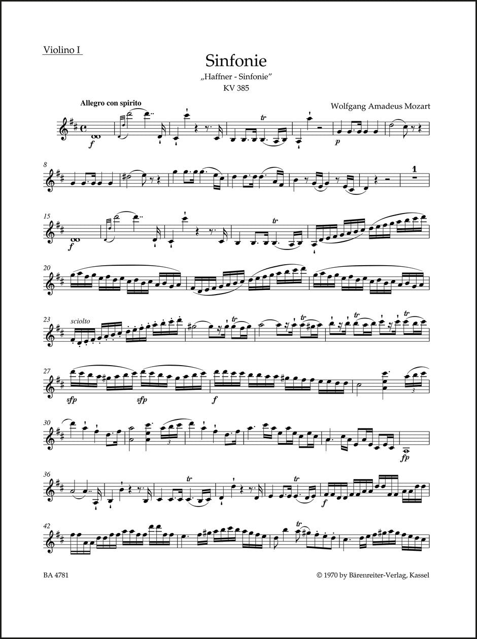 **Title**: Symphony no. 35 in D major K. 385 "Haffner Symphony" | **Composer / Author**: Mozart, Wolfgang Amadeus | **Editor**: Mahling, Christoph-Hellmut | **Edition Type**: Part, Urtext edition | **Scoring/ Instrumentation**: 1. Violin | **Binding**: Stapled | **Weight**: 52.0 g | **Format**: 32,5 x 25,5 cm | **Pages**: 11 S. | **Language**: EN | Sample: https://data.baerenreiter.com/NB/BA/BA04781_74_9790006456390_nb_lrg_01.jpg
