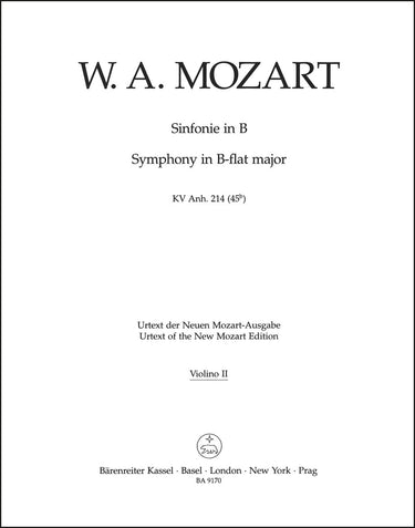 **Title**: Symphony in B-flat major K. Anh. 214 (45b) | **Composer / Author**: Mozart, Wolfgang Amadeus | **Editor**: Allroggen, Gerhard | **Edition Type**: Part, Urtext edition | **Scoring/ Instrumentation**: 2. Violin | **Binding**: Stapled | **Weight**: 29.0 g | **Format**: 32,5 x 25,5 cm | **Pages**: 5 S. | **Language**: EN | Sample: https://data.baerenreiter.com/NB/BA/BA09170_75_9790006528400_nb_lrg_01.jpg