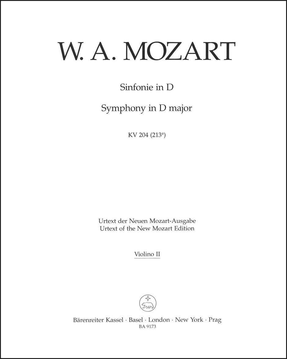 **Title**: Symphony in D major | **Misc Information**: based on Serenade K. 250 (248b) | **Composer / Author**: Mozart, Wolfgang Amadeus | **Editor**: Haußwald, Günter | **Edition Type**: Part, Urtext edition | **Scoring/ Instrumentation**: 2. Violin | **Binding**: Stapled | **Weight**: 30.0 g | **Format**: 32,5 x 25,5 cm | **Pages**: 8 S. | **Language**: EN | Sample: https://data.baerenreiter.com/NB/BA/BA09173_75_9790006528585_nb_lrg_01.jpg