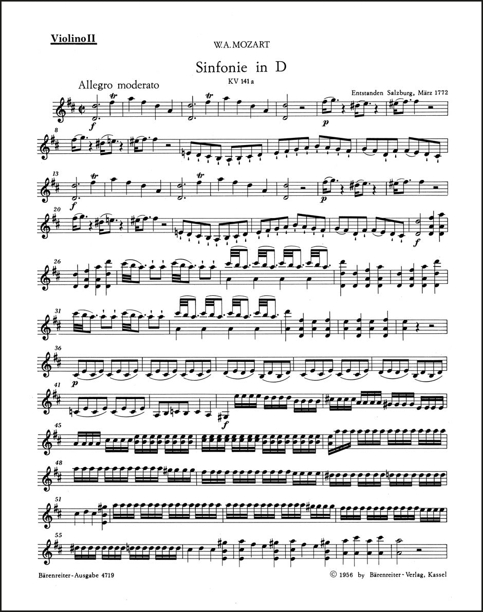 **Title**: Symphony in D major K. 141a(161) | **Subtitle**: Overture to K. 126 "Il sogno di Scipione" | **Composer / Author**: Mozart, Wolfgang Amadeus | **Editor**: Fischer, Wilhelm | **Edition Type**: Part, Urtext edition | **Scoring/ Instrumentation**: 2. Violin | **Binding**: Stapled | **Weight**: 24.0 g | **Format**: 32,5 x 25,0 cm | **Pages**: 5/4 S. | **Language**: EN | Sample: https://data.baerenreiter.com/NB/BA/BA04719_75_9790006454013_nb_lrg_01.jpg