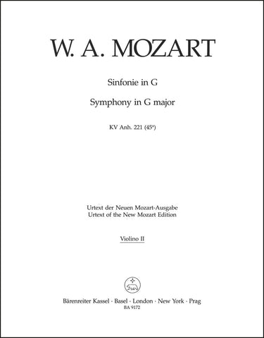 **Title**: Symphony in G major K. Anh. 221 (45a) | **Subtitle**: Early and late versions | **Composer / Author**: Mozart, Wolfgang Amadeus | **Editor**: Allroggen, Gerhard | **Edition Type**: Part, Urtext edition | **Scoring/ Instrumentation**: 2. Violin | **Binding**: Stapled | **Weight**: 44.0 g | **Format**: 32,5 x 25,5 cm | **Pages**: 9 S. | **Language**: EN | Sample: https://data.baerenreiter.com/NB/BA/BA09172_75_9790006528523_nb_lrg_01.jpg