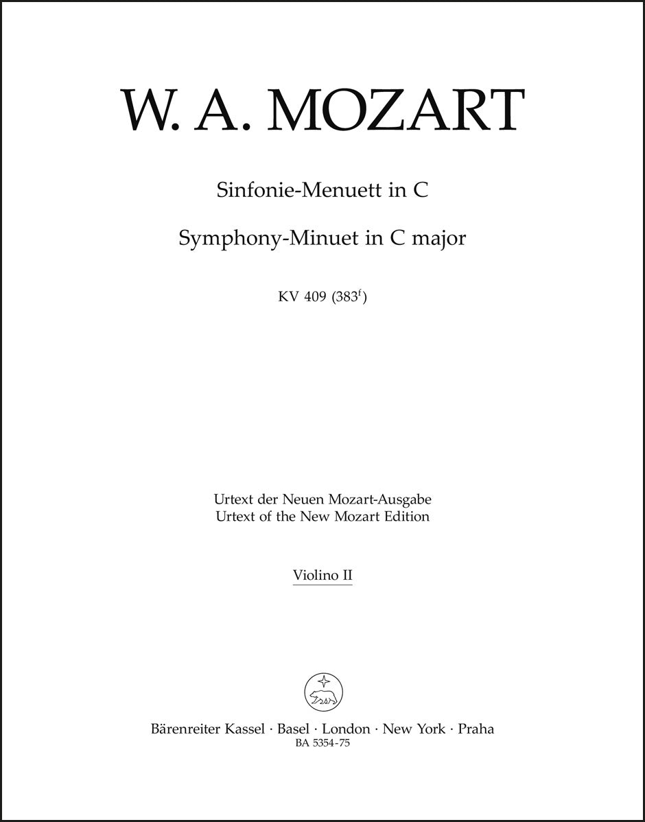 **Title**: Symphony Minuett in C major K. 409 | **Composer / Author**: Mozart, Wolfgang Amadeus | **Editor**: Plath, Wolfgang | **Edition Type**: Part, Urtext edition | **Scoring/ Instrumentation**: 2. Violin | **Binding**: Stapled | **Weight**: 17.0 g | **Format**: 32,5 x 25,5 cm | **Pages**: 3 S. | **Language**: EN | Sample: https://data.baerenreiter.com/NB/BA/BA05354_75_9790006468904_nb_lrg_01.jpg
