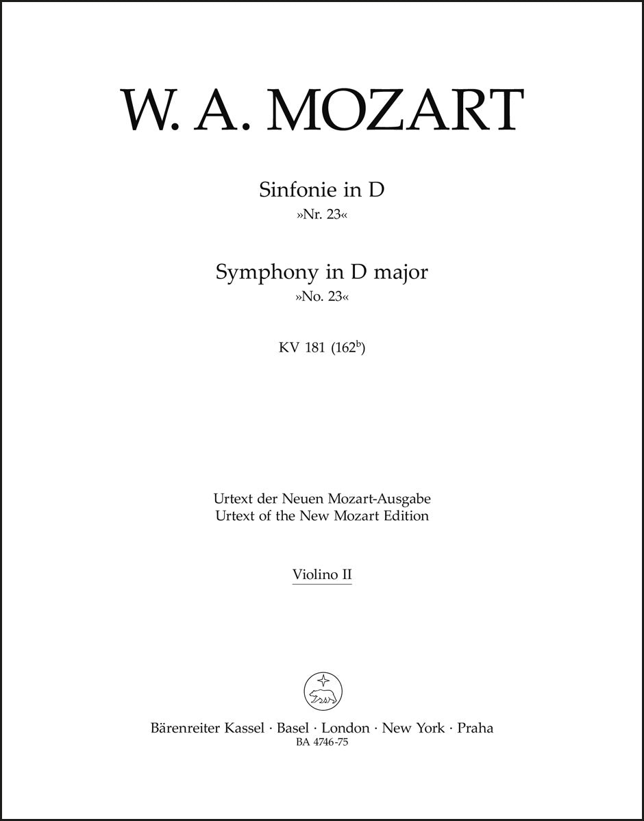 **Title**: Symphony no. 23 in D major K. 181 (162b) | **Composer / Author**: Mozart, Wolfgang Amadeus | **Editor**: Beck, Hermann | **Edition Type**: Part, Urtext edition | **Scoring/ Instrumentation**: 2. Violin | **Binding**: Stapled | **Weight**: 34.0 g | **Format**: 32,5 x 25,5 cm | **Pages**: 6 S. | **Language**: EN | Sample: https://data.baerenreiter.com/NB/BA/BA04746_75_9790006455249_nb_lrg_01.jpg
