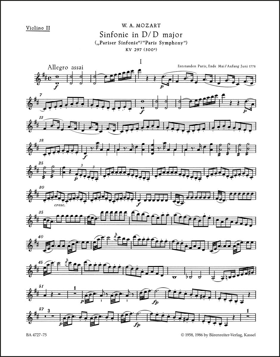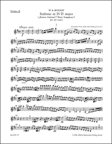**Title**: Symphony no. 31 in D major K. 297 (300a) "Paris Symphony" | **Composer / Author**: Mozart, Wolfgang Amadeus | **Editor**: Beck, Hermann | **Edition Type**: Part, Urtext edition | **Scoring/ Instrumentation**: 2. Violin | **Binding**: Stapled | **Duration**: 00:17:00 | **Weight**: 50.0 g | **Format**: 32,5 x 25,5 cm | **Pages**: 10 S. | **Language**: EN | Sample: https://data.baerenreiter.com/NB/BA/BA04727_75_9790006454419_nb_lrg_01.jpg