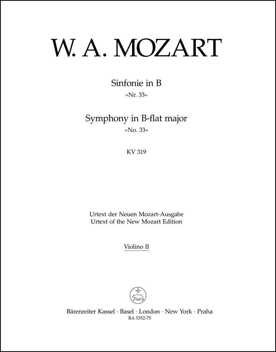 **Title**: Symphony no. 33 in B-flat major K. 319 | **Composer / Author**: Mozart, Wolfgang Amadeus | **Editor**: Mahling, Christoph-Hellmut | **Edition Type**: Part, Urtext edition | **Scoring/ Instrumentation**: 2. Violin | **Binding**: Stapled | **Weight**: 50.0 g | **Format**: 32,5 x 25,5 cm | **Pages**: 11 S. | **Language**: EN | Sample: https://data.baerenreiter.com/NB/BA/BA05352_75_9790006468775_nb_lrg_01.jpg