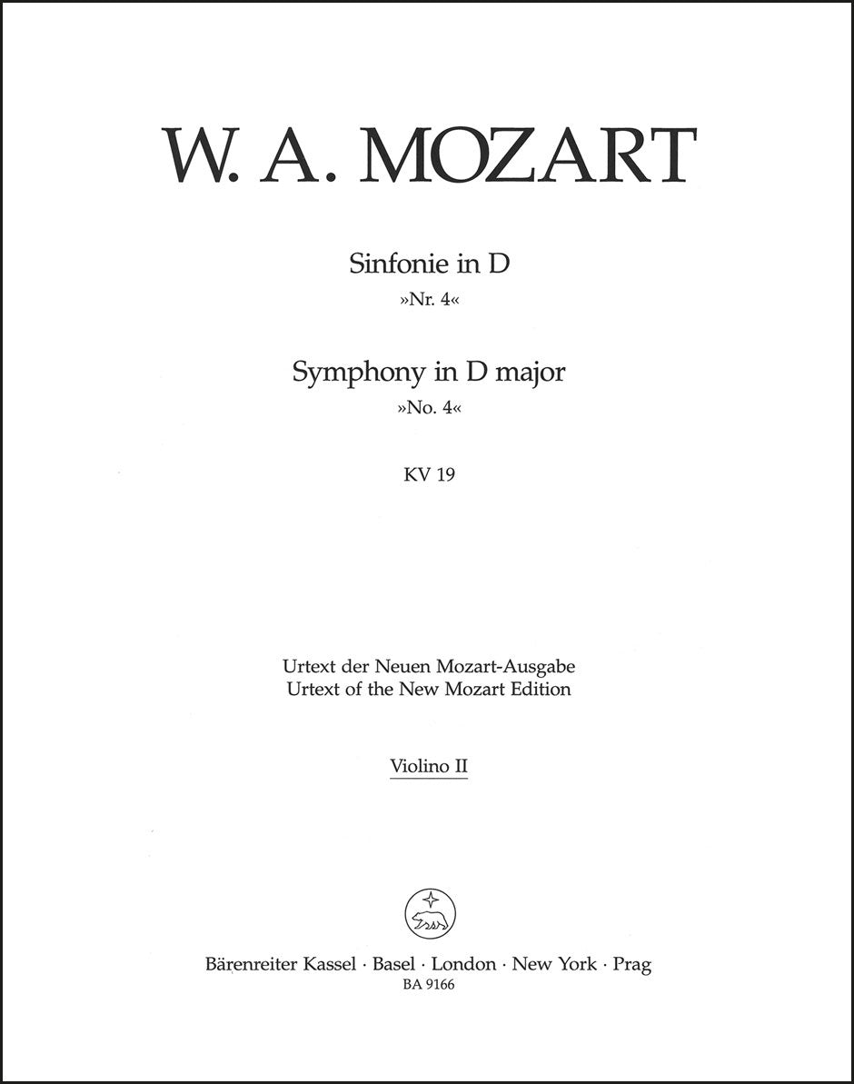 **Title**: Symphony no. 4 in D major K. 19 | **Composer / Author**: Mozart, Wolfgang Amadeus | **Editor**: Allroggen, Gerhard | **Edition Type**: Part, Urtext edition | **Scoring/ Instrumentation**: 2. Violin | **Binding**: Stapled | **Weight**: 29.0 g | **Format**: 32,5 x 25,5 cm | **Pages**: 5 S. | **Language**: EN | Sample: https://data.baerenreiter.com/NB/BA/BA09166_75_9790006528103_nb_lrg_01.jpg