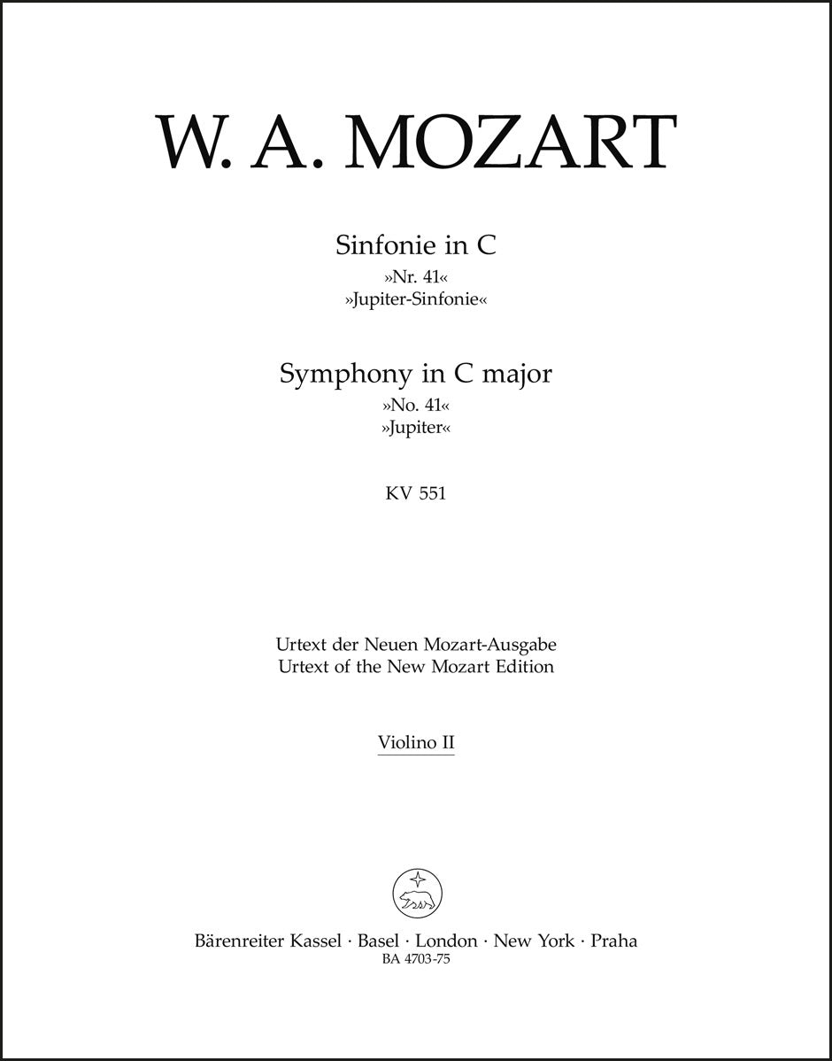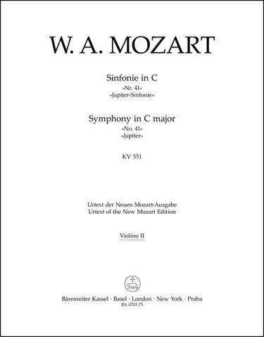 **Title**: Symphony no. 41 in C major K. 551 "Jupiter Symphony" | **Composer / Author**: Mozart, Wolfgang Amadeus | **Editor**: Landon, H. C. Robbins | **Edition Type**: Part, Urtext edition | **Scoring/ Instrumentation**: 2. Violin | **Binding**: Stapled | **Weight**: 66.0 g | **Format**: 32,5 x 25,5 cm | **Pages**: 14 S. | **Language**: EN | Sample: https://data.baerenreiter.com/NB/BA/BA04703_75_9790006453313_nb_lrg_01.jpg
