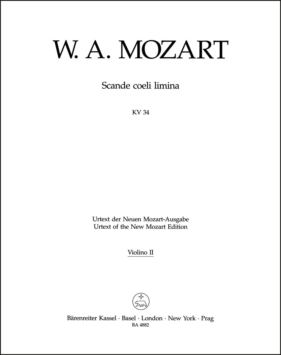 **Title**: Scande coeli limina K. 34 | **Composer / Author**: Mozart, Wolfgang Amadeus | **Editor**: Federhofer, Hellmut | **Edition Type**: Part, Urtext edition | **Scoring/ Instrumentation**: 2. Violin | **Binding**: Stapled | **Duration**: 00:04:00 | **Printing**: 2006 | **Weight**: 15.0 g | **Format**: 32,5 x 25,5 cm | **Pages**: 4 S. | **Language**: EN | Sample: https://data.baerenreiter.com/NB/BA/BA04882_75_9790006458691_nb_lrg_01.jpg