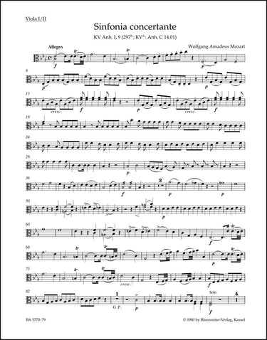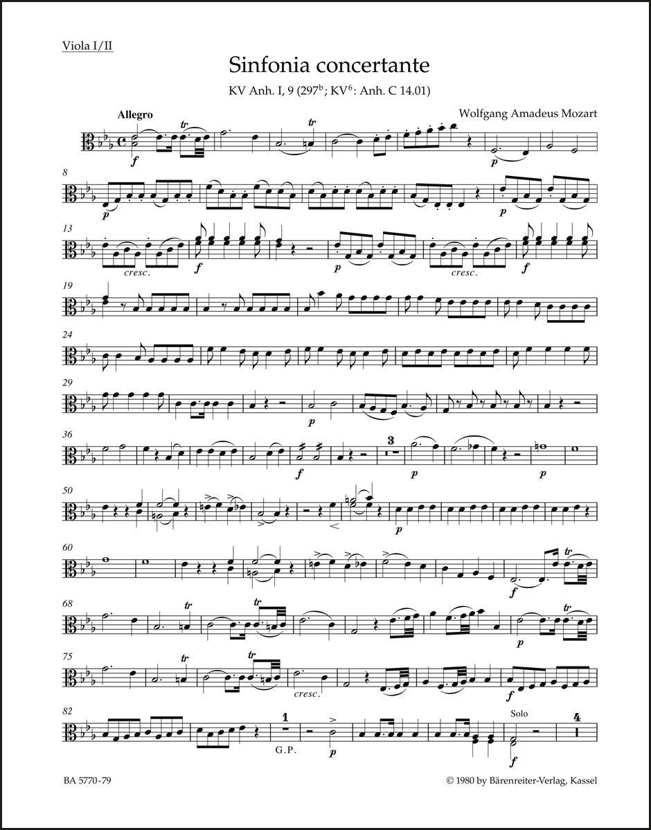 **Title**: Sinfonia concertante for Oboe, Clarinet, Horn, Bassoon and Orchestra in E-flat major K. Anh. I,9 (297b) | **Composer / Author**: Mozart, Wolfgang Amadeus | **Editor**: Plath, Wolfgang | **Edition Type**: Part, Urtext edition | **Scoring/ Instrumentation**: Viola | **Binding**: Stapled | **Duration**: 00:32:00 | **Weight**: 50.0 g | **Format**: 32,5 x 25,5 cm | **Pages**: 11 S. | **Language**: EN | Sample: https://data.baerenreiter.com/NB/BA/BA05770_79_9790006526857_nb_lrg_01.jpg