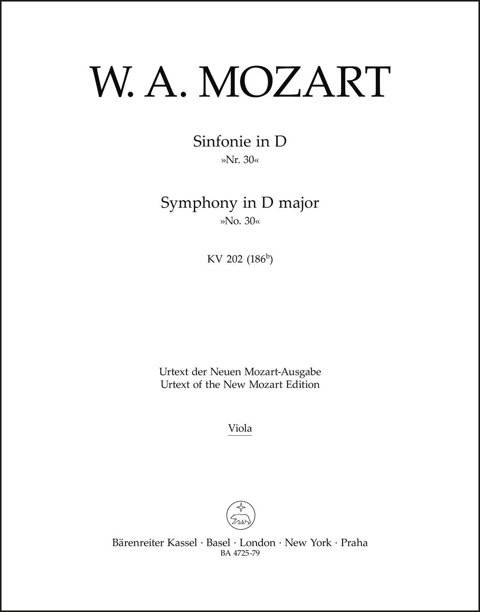**Title**: Symphony no. 30 in D major K. 202(186b) | **Composer / Author**: Mozart, Wolfgang Amadeus | **Editor**: Beck, Hermann | **Edition Type**: Part, Urtext edition | **Scoring/ Instrumentation**: Viola | **Binding**: Stapled | **Weight**: 33.0 g | **Format**: 32,5 x 25,5 cm | **Pages**: 7 S. | **Language**: EN | Sample: https://data.baerenreiter.com/NB/BA/BA04725_79_9790006454303_nb_lrg_01.jpg