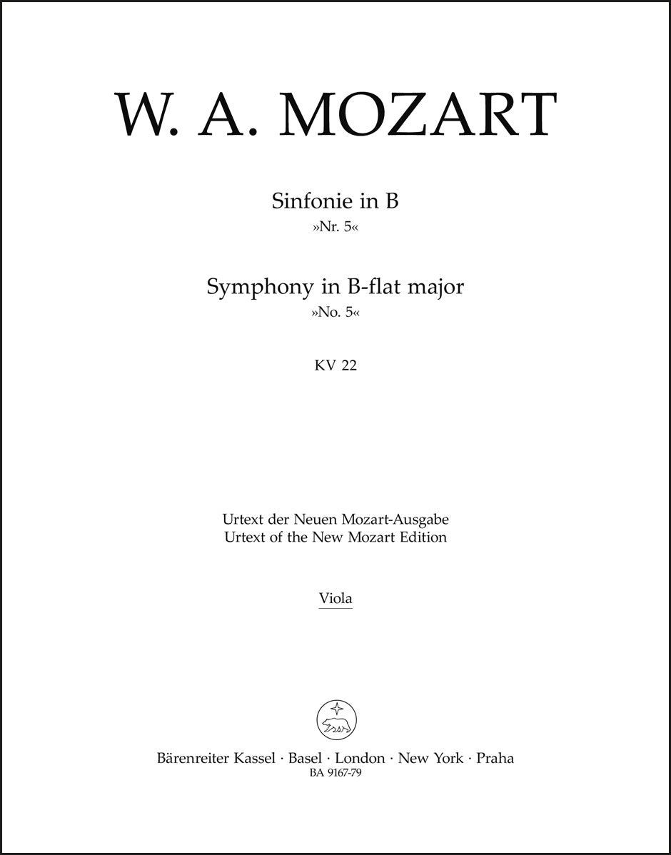 **Title**: Symphony no. 5 in B-flat major K. 22 | **Composer / Author**: Mozart, Wolfgang Amadeus | **Editor**: Allroggen, Gerhard | **Edition Type**: Part, Urtext edition | **Scoring/ Instrumentation**: Viola | **Binding**: Stapled | **Weight**: 33.0 g | **Format**: 32,5 x 25,5 cm | **Pages**: 5 S. | **Language**: EN | Sample: https://data.baerenreiter.com/NB/BA/BA09167_79_9790006528233_nb_lrg_01.jpg