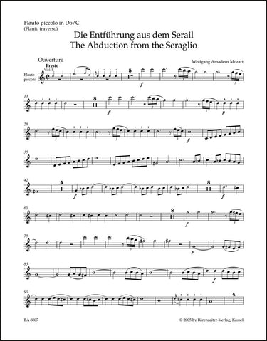 **Title**: The Abduction from the Seraglio K. 384 | **Subtitle**: Overture with the Johann Anton André concert ending | **Composer / Author**: Mozart, Wolfgang Amadeus | **Editor**: Croll, Gerhard | **Edition Type**: Wind set, Urtext edition | **Scoring/ Instrumentation**: Trumpets (2), Clarinets (2), Piccolo flute (Flute), Oboes (2), Bassoons (2), Horns (2), Timpani, Drums | **Binding**: Folded | **Duration**: 00:06:00 | **Weight**: 264.0 g | **Format**: 32,5 x 25,5 cm | **Pages**: 3/3/3/3/3/3/3/3/3/3/3/3/3/3/3/3 S. | **Language**: EN | Sample: https://data.baerenreiter.com/NB/BA/BA08807_65_9790006524754_nb_lrg_01.jpg