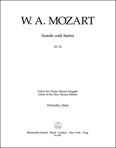 **Title**: Scande coeli limina K. 34 | **Composer / Author**: Mozart, Wolfgang Amadeus | **Editor**: Federhofer, Hellmut | **Edition Type**: Part, Urtext edition | **Scoring/ Instrumentation**: Violoncello, Double bass | **Binding**: Stapled | **Duration**: 00:04:00 | **Printing**: 2006 | **Weight**: 15.0 g | **Format**: 32,5 x 25,5 cm | **Pages**: 4 S. | **Language**: EN | Sample: https://data.baerenreiter.com/NB/BA/BA04882_82_9790006458707_nb_lrg_01.jpg