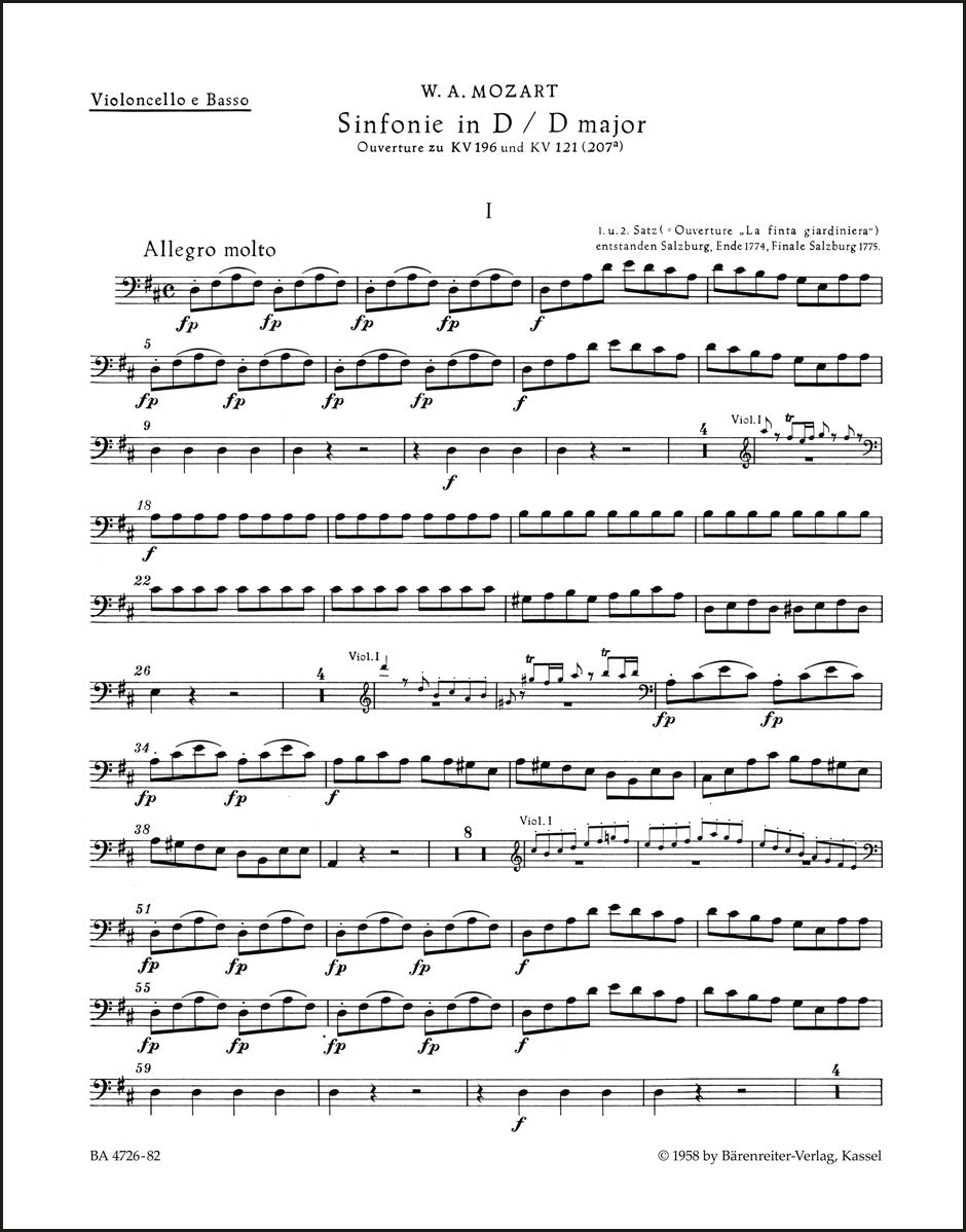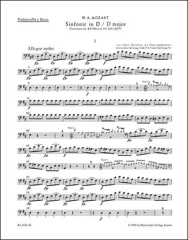 **Title**: Symphony in D major K. 196, 121 (207a) | **Subtitle**: Overture to "La finta giardiniera" K. 196 und K. 121 (207a) | **Composer / Author**: Mozart, Wolfgang Amadeus | **Editor**: Beck, Hermann | **Edition Type**: Part, Urtext edition | **Scoring/ Instrumentation**: Violoncello, Double bass | **Binding**: Folded | **Weight**: 17.0 g | **Format**: 32,5 x 25,5 cm | **Pages**: 4 S. | **Language**: EN | Sample: https://data.baerenreiter.com/NB/BA/BA04726_82_9790006454372_nb_lrg_01.jpg