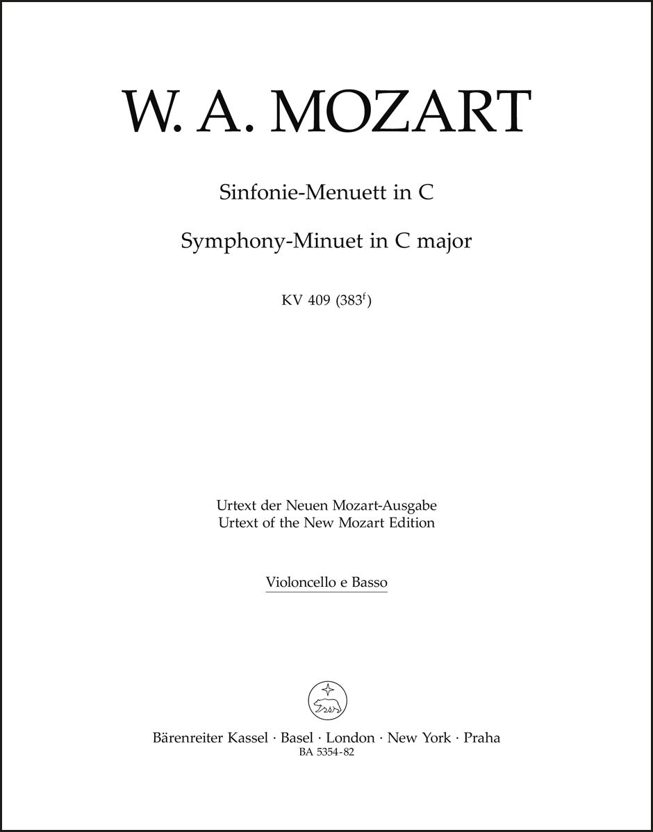 **Title**: Symphony Minuett in C major K. 409 | **Composer / Author**: Mozart, Wolfgang Amadeus | **Editor**: Plath, Wolfgang | **Edition Type**: Part, Urtext edition | **Scoring/ Instrumentation**: Violoncello, Double bass | **Binding**: Stapled | **Weight**: 16.0 g | **Format**: 32,5 x 25,5 cm | **Pages**: 1 S. | **Language**: EN | Sample: https://data.baerenreiter.com/NB/BA/BA05354_82_9790006468928_nb_lrg_01.jpg