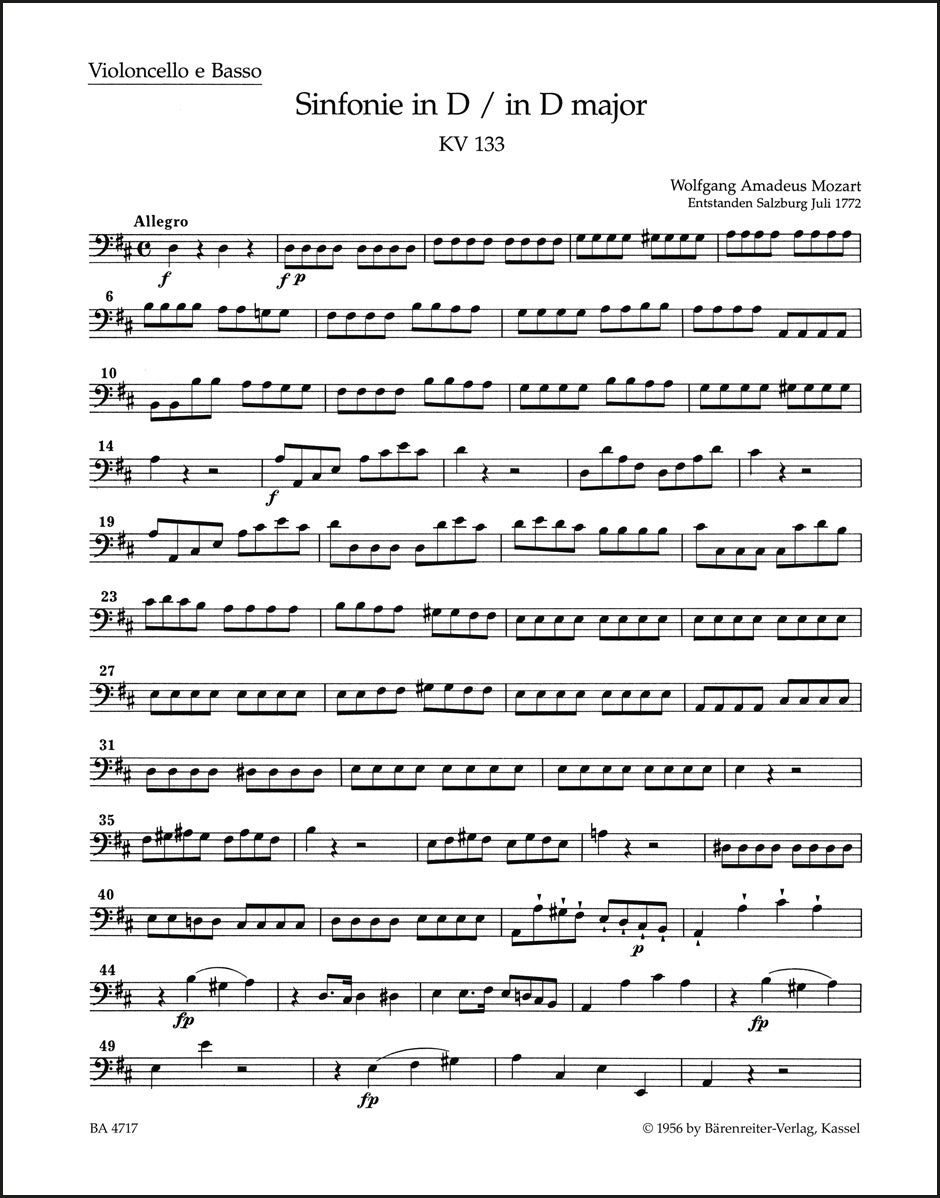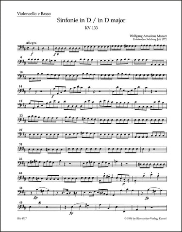 **Title**: Symphony no. 20 in D major K. 133 | **Composer / Author**: Mozart, Wolfgang Amadeus | **Editor**: Fischer, Wilhelm | **Edition Type**: Part, Urtext edition | **Scoring/ Instrumentation**: Violoncello, Double bass | **Binding**: Stapled | **Weight**: 33.0 g | **Format**: 32,5 x 25,5 cm | **Pages**: 6 S. | **Language**: EN | Sample: https://data.baerenreiter.com/NB/BA/BA04717_82_9790006453917_nb_lrg_01.jpg