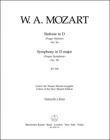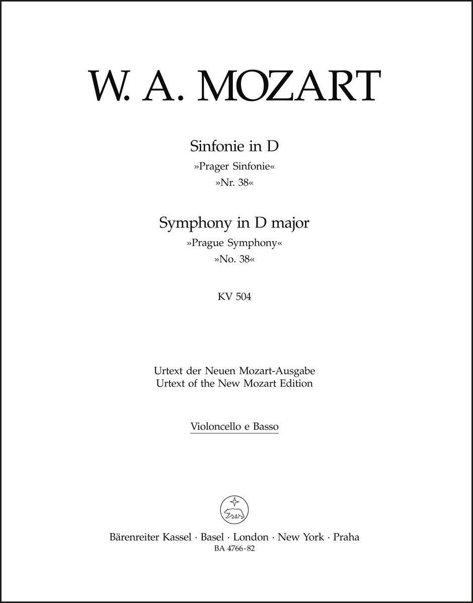 **Title**: Symphony no. 38 in D major K. 504 "Prague Symphony" | **Composer / Author**: Mozart, Wolfgang Amadeus | **Editor**: Somfai, László | **Edition Type**: Part, Urtext edition | **Scoring/ Instrumentation**: Violoncello, Double bass | **Binding**: Stapled | **Weight**: 51.0 g | **Format**: 32,5 x 25,5 cm | **Pages**: 9 S. | **Language**: EN | Sample: https://data.baerenreiter.com/NB/BA/BA04766_82_9790006455997_nb_lrg_01.jpg