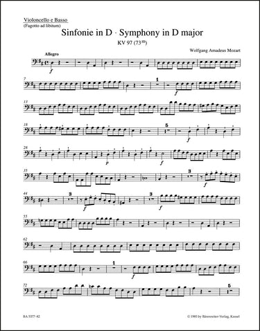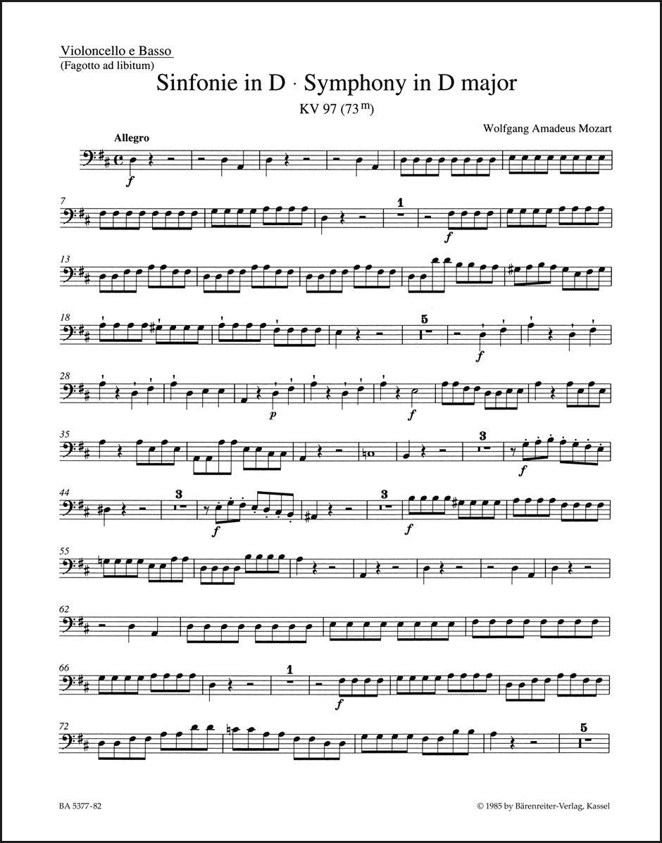 **Title**: Symphony no. 47 in D major K. 97 (73m) | **Composer / Author**: Mozart, Wolfgang Amadeus | **Libretto/Text by**: Allroggen, Gerhard | **Edition Type**: Part, Urtext edition | **Scoring/ Instrumentation**: Violoncello, Double bass, Bassoon | **Binding**: Stapled | **Duration**: 00:09:00 | **Weight**: 17.0 g | **Format**: 32,5 x 25,5 cm | **Pages**: 4 S. | **Language**: EN | Sample: https://data.baerenreiter.com/NB/BA/BA05377_82_9790006501564_nb_lrg_01.jpg