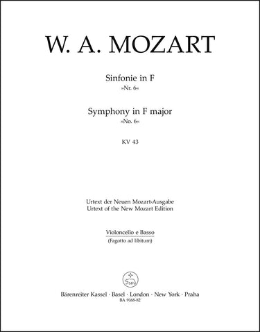 **Title**: Symphony no. 6 in F major K. 43 | **Composer / Author**: Mozart, Wolfgang Amadeus | **Editor**: Allroggen, Gerhard | **Edition Type**: Part, Urtext edition | **Scoring/ Instrumentation**: Violoncello, Double bass | **Binding**: Stapled | **Weight**: 33.0 g | **Format**: 32,5 x 25,5 cm | **Pages**: 6 S. | **Language**: EN | Sample: https://data.baerenreiter.com/NB/BA/BA09168_82_9790006528301_nb_lrg_01.jpg