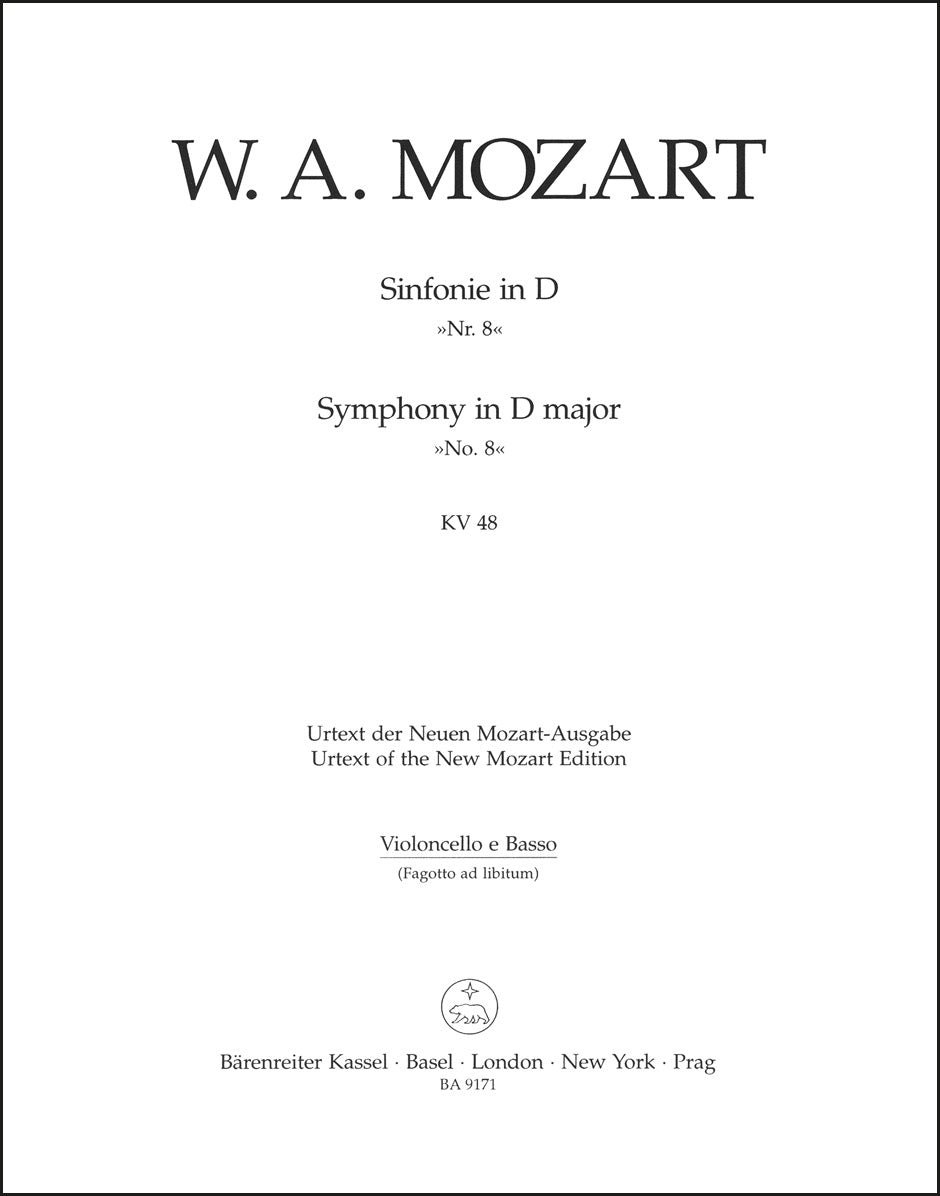 **Title**: Symphony no. 8 in D major K. 48 | **Composer / Author**: Mozart, Wolfgang Amadeus | **Editor**: Allroggen, Gerhard | **Edition Type**: Part, Urtext edition | **Scoring/ Instrumentation**: Violoncello, Double bass | **Binding**: Stapled | **Weight**: 30.0 g | **Format**: 32,5 x 25,5 cm | **Pages**: 7 S. | **Language**: EN | Sample: https://data.baerenreiter.com/NB/BA/BA09171_82_9790006528486_nb_lrg_01.jpg