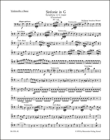 **Title**: Symphony (Overture) no. 32 in G major K. 318 | **Composer / Author**: Mozart, Wolfgang Amadeus | **Editor**: Mahling, Christoph-Hellmut | **Edition Type**: Part, Urtext edition | **Scoring/ Instrumentation**: Violoncello, Double bass | **Binding**: Stapled | **Duration**: 00:09:00 | **Weight**: 16.0 g | **Format**: 32,5 x 25,5 cm | **Pages**: 3 S. | **Language**: EN | Sample: https://data.baerenreiter.com/NB/BA/BA05351_82_9790006468737_nb_lrg_01.jpg