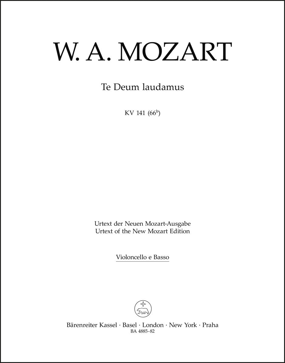 **Title**: Te Deum laudamus K. 141 (66b) | **Composer / Author**: Mozart, Wolfgang Amadeus | **Editor**: Federhofer, Hellmut | **Edition Type**: Part, Urtext edition | **Scoring/ Instrumentation**: Violoncello, Double bass, Bassoon | **Binding**: Stapled | **Duration**: 00:11:00 | **Weight**: 17.0 g | **Format**: 32,5 x 25,5 cm | **Pages**: 4 S. | **Language**: EN | Sample: https://data.baerenreiter.com/NB/BA/BA04885_82_9790006458974_nb_lrg_01.jpg