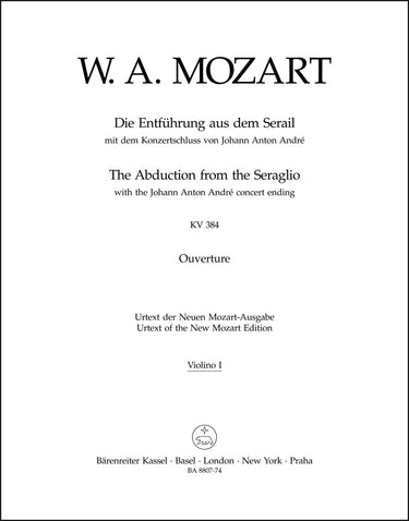 **Title**: The Abduction from the Seraglio K. 384 | **Subtitle**: Overture with the Johann Anton André concert ending | **Composer / Author**: Mozart, Wolfgang Amadeus | **Editor**: Croll, Gerhard | **Edition Type**: Part, Urtext edition | **Scoring/ Instrumentation**: 1. Violin | **Binding**: Stapled | **Duration**: 00:06:00 | **Weight**: 34.0 g | **Format**: 32,5 x 25,5 cm | **Pages**: 5 S. | **Language**: EN | Sample: https://data.baerenreiter.com/NB/BA/BA08807_74_9790006524761_nb_lrg_01.jpg