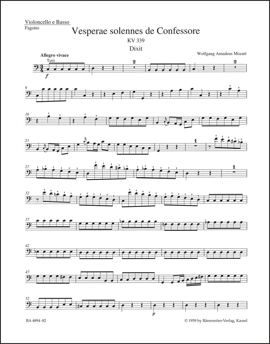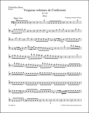 **Title**: Vesperae solennes de Confessore K. 339 | **Composer / Author**: Mozart, Wolfgang Amadeus | **Editor**: Fellerer, Karl Gustav / Schroeder, Felix | **Edition Type**: Part, Urtext edition | **Scoring/ Instrumentation**: Violoncello, Double bass, Bassoon | **Binding**: Stapled | **Weight**: 65.0 g | **Format**: 32,5 x 25,5 cm | **Pages**: 16 S. | **Language**: EN | Sample: https://data.baerenreiter.com/NB/BA/BA04894_82_9790006459742_nb_lrg_01.jpg