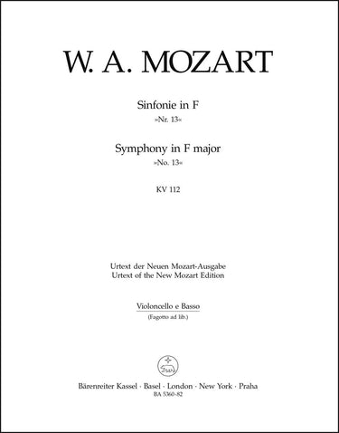 **Title**: Symphony no. 13 in F major K. 112 | **Composer / Author**: Mozart, Wolfgang Amadeus | **Editor**: Allroggen, Gerhard | **Edition Type**: Part, Urtext edition | **Scoring/ Instrumentation**: Violoncello, Double bass | **Binding**: Stapled | **Weight**: 33.0 g | **Format**: 32,5 x 25,5 cm | **Pages**: 5 S. | **Language**: EN | Sample: https://data.baerenreiter.com/NB/BA/BA05360_82_9790006469239_nb_lrg_01.jpg