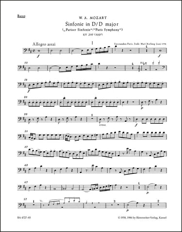 **Title**: Symphony no. 31 in D major K. 297 (300a) "Paris Symphony" | **Composer / Author**: Mozart, Wolfgang Amadeus | **Editor**: Beck, Hermann | **Edition Type**: Part, Urtext edition | **Scoring/ Instrumentation**: Double bass | **Binding**: Stapled | **Duration**: 00:17:00 | **Weight**: 50.0 g | **Format**: 32,5 x 25,5 cm | **Pages**: 9 S. | **Language**: EN | Sample: https://data.baerenreiter.com/NB/BA/BA04727_85_9790006454440_nb_lrg_01.jpg