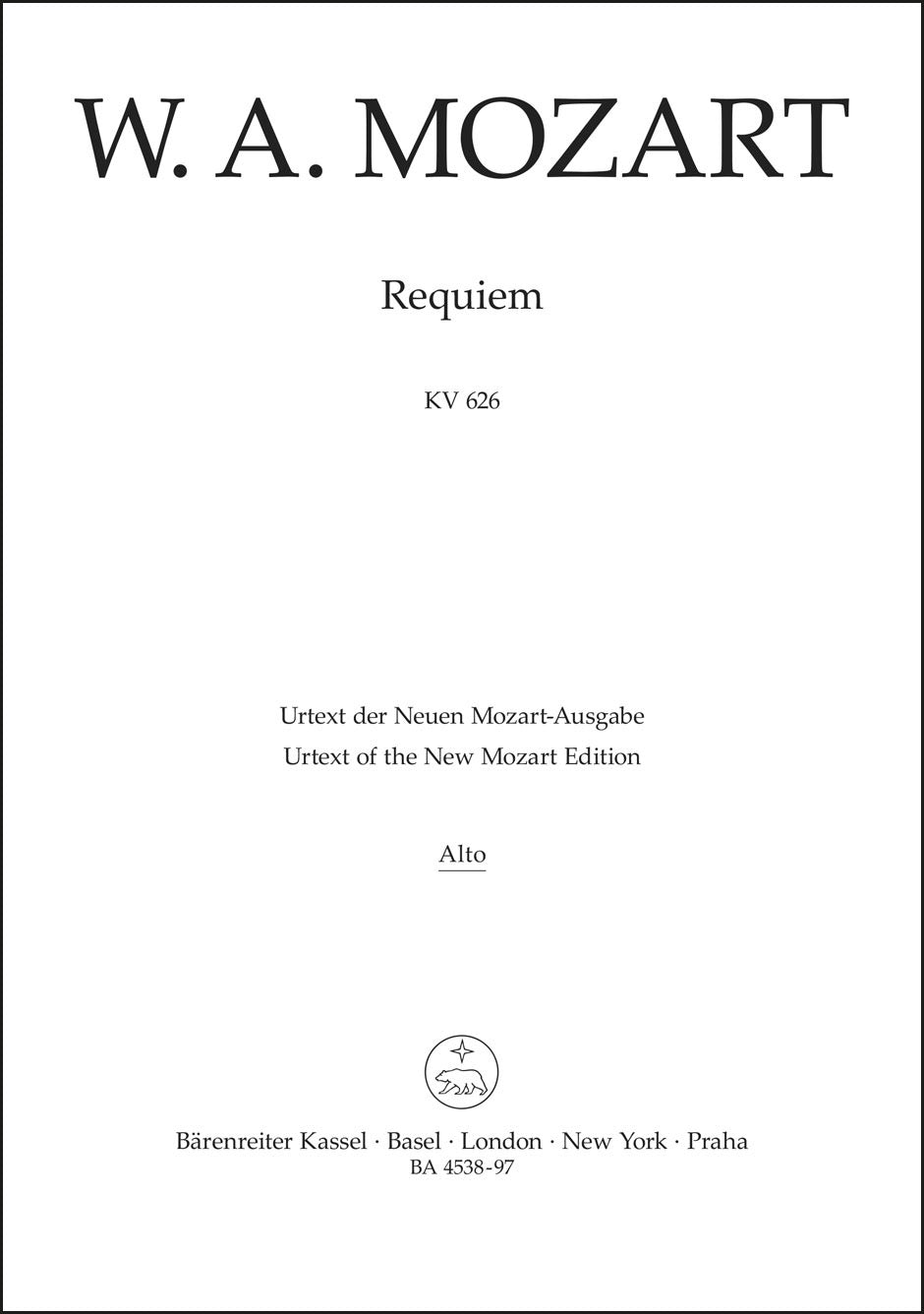 **Title**: Requiem K. 626 | **Subtitle**: The Requiem, completed by Franz Xaver Süßmayr, in its traditional form | **Composer / Author**: Mozart, Wolfgang Amadeus / Süßmayr, Franz Xaver | **Editor**: Nowak, Leopold | **Edition Type**: Part, Urtext edition | **Scoring/ Instrumentation**: Alto (Choral voice) | **Binding**: Stapled | **Duration**: 00:55:00 | **Weight**: 42.0 g | **Format**: 27,0 x 19,0 cm | **Pages**: 15 S. | **Language**: EN | Sample: https://data.baerenreiter.com/NB/BA/BA04538_97_9790006450176_nb_lrg_01.jpg