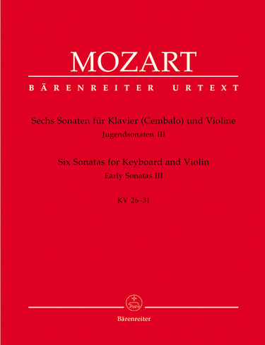 **Title**: Six Sonatas for Violin and Piano K. 26-31 | **Subtitle**: Early Sonatas III | **Misc Information**: Sonatas for Violin | **Composer / Author**: Mozart, Wolfgang Amadeus | **Editor**: Reeser, Eduard | **Edition Type**: Performance score, Part, Urtext edition, Anthology | **Instrumentation**: Violin, Piano | **Scoring/ Instrumentation**: Violin, Piano, Harpsichord | **Binding**: Stapled | **Level of Difficulty**: 2.0 | **Printing**: 6th printing 2023 | **Weight**: 239.0 g | **Format**: 31,0 x 24,3 cm | **Pages**: 35/15 S. | **Language**: EN | Sample: https://data.baerenreiter.com/NB/BA/BA04757_00_9790006455768_nb_lrg_01.jpg